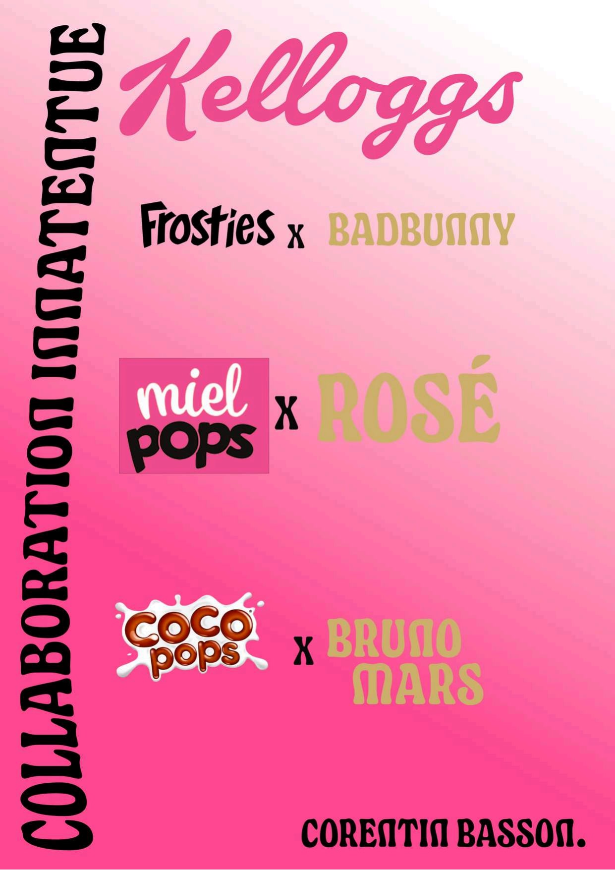 Associer trois céréales iconiques Kellogg's à trois artistes internationaux dans le cadre d'une édition spéciale Saint-Valentin. Bad Bunny pour Frosties (énergie brute et style audacieux), Rosé de BLACKPINK pour Miel Pops (douceur et élégance), Bruno Mars pour Coco Pops (groove, nostalgie et fun). Chaque duo artiste/céréale crée une cohérence visuelle et émotionnelle forte, portée par un univers romantique et festif.