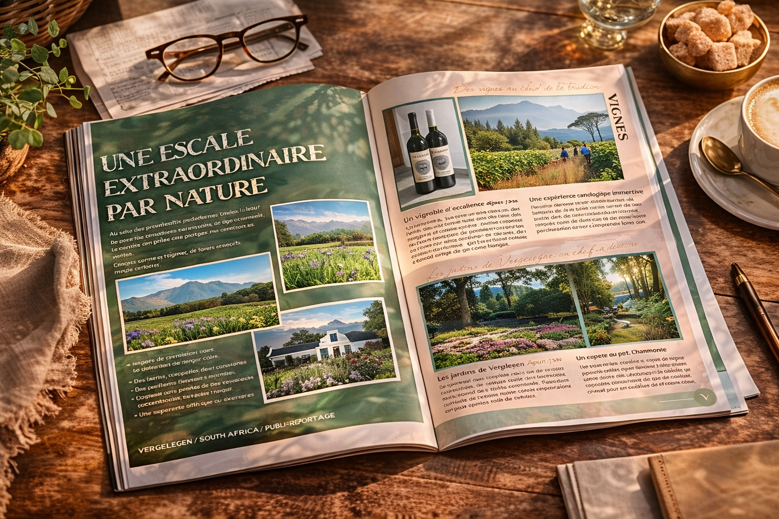 Conception d'un publireportage touristique mettant en valeur le domaine Vergelegen à travers une approche éditoriale immersive et une direction artistique inspirée des magazines de voyage.